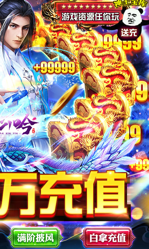 2、上线壕礼:上线送满级仙帝,88W绑元,2亿铜币、0氪白拿万元充值卡礼包,可激活累充活动!
