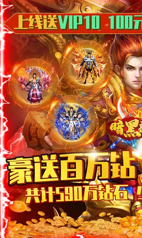 1、上线送VIP10,100万元宝,100元充值卡。